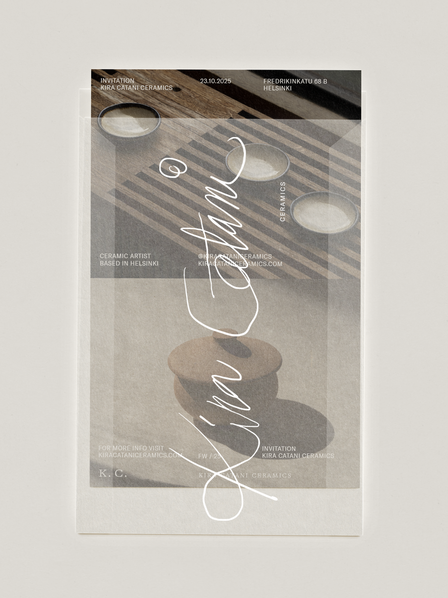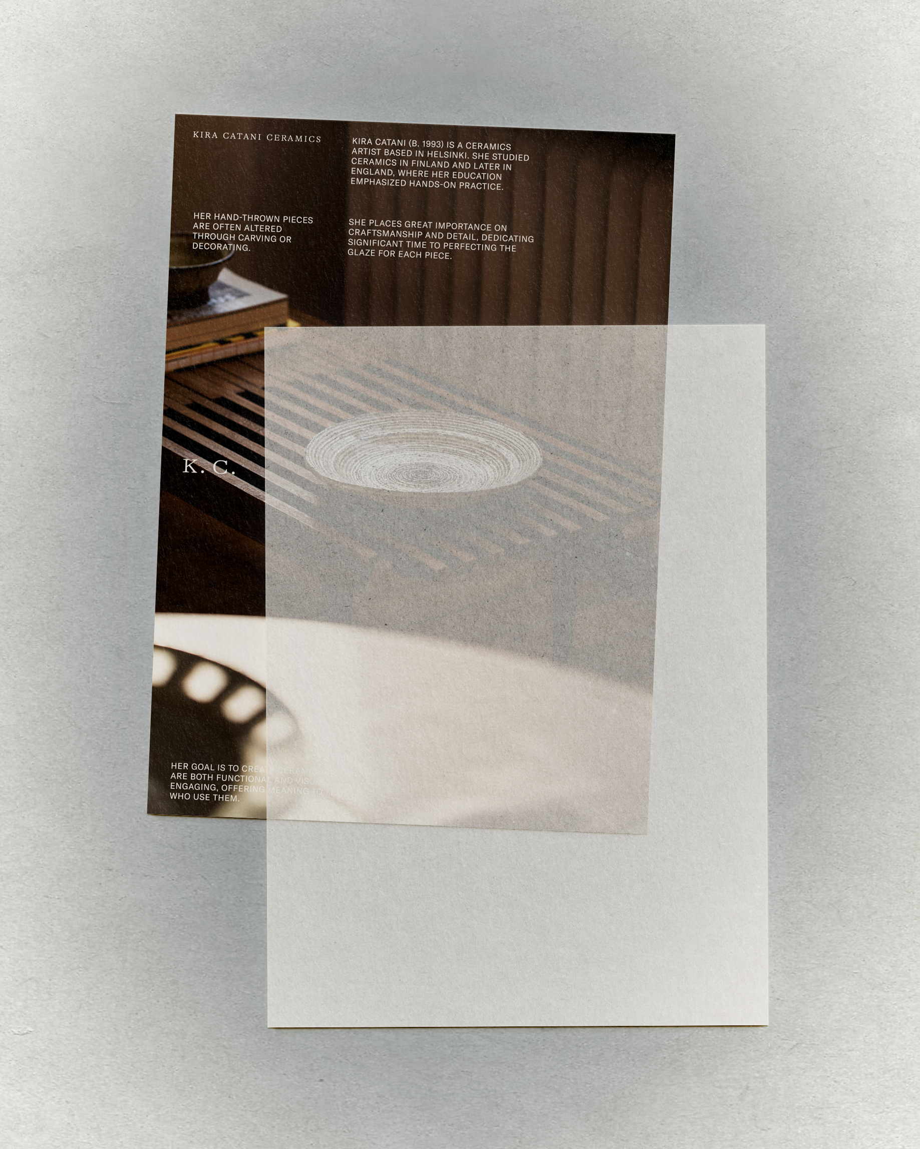 Kira Catani is a Helsinki-based ceramics artist whose work centers on wheel-throwing. Educated in Finland and England, she developed a strong appreciation for materials and hands-on craftsmanship. Her pieces are hand-thrown, often refined through carving or decorative techniques. With great attention to detail, she carefully develops each glaze, aiming to create ceramics that are both functional and visually engaging.