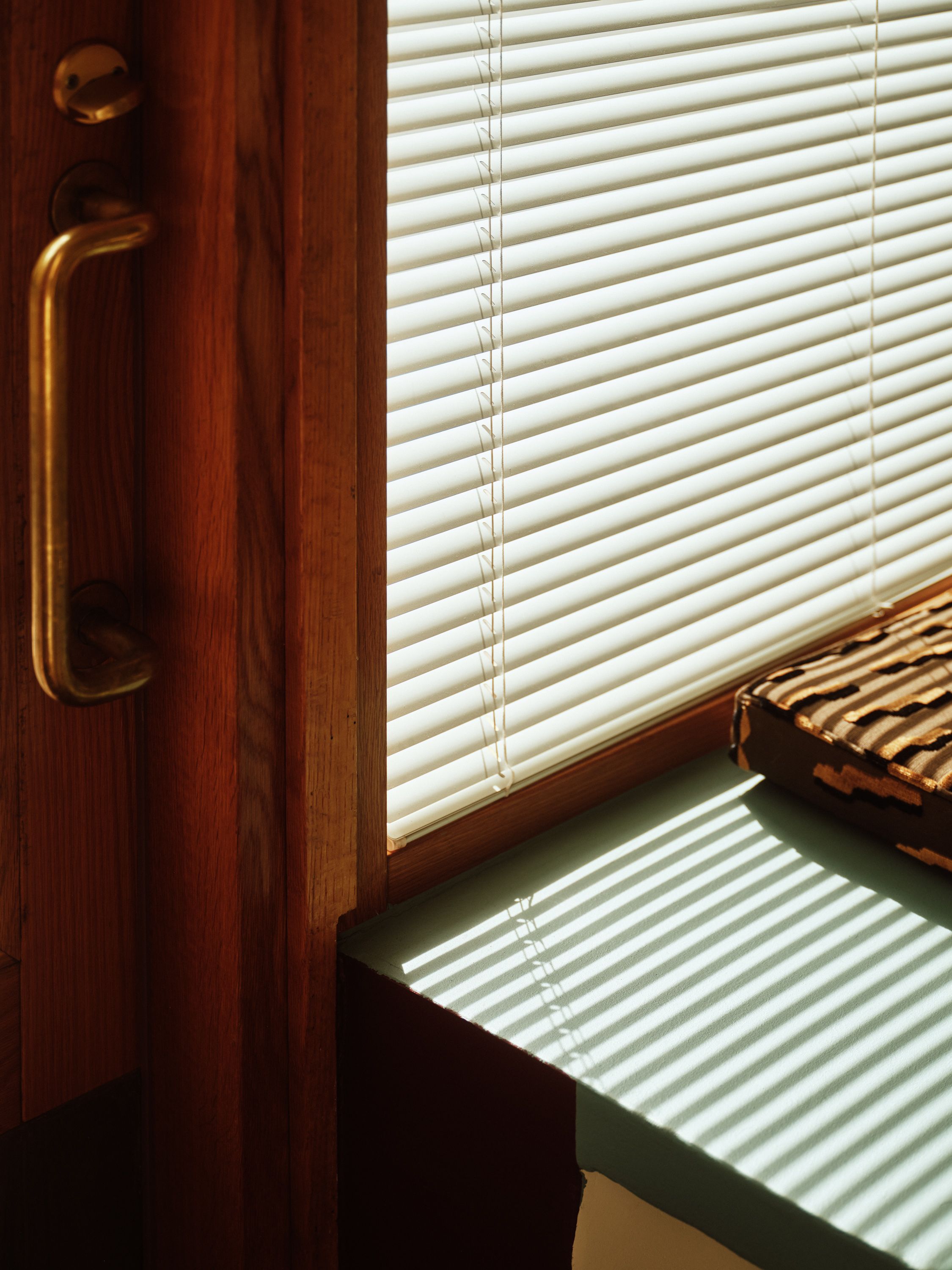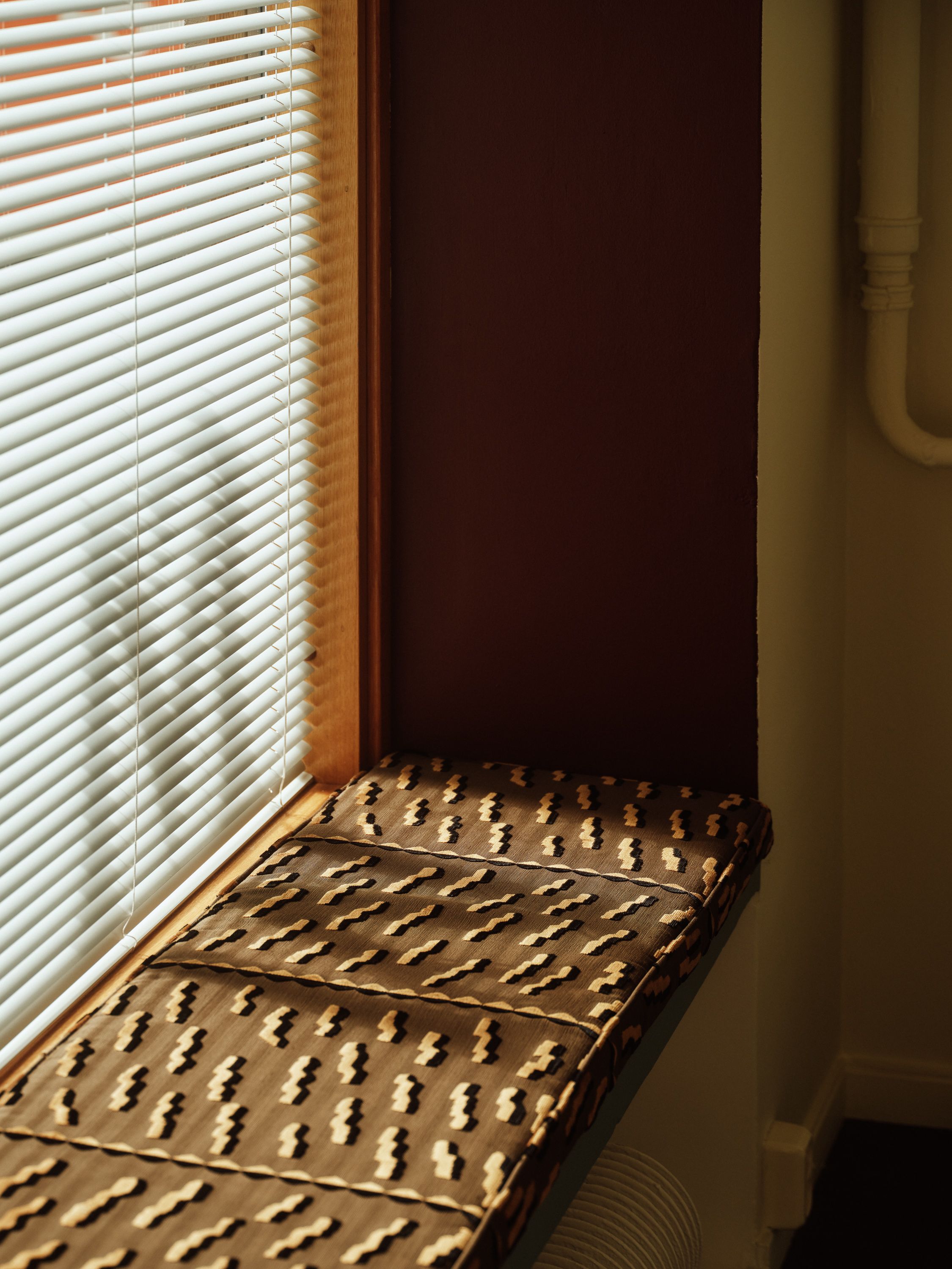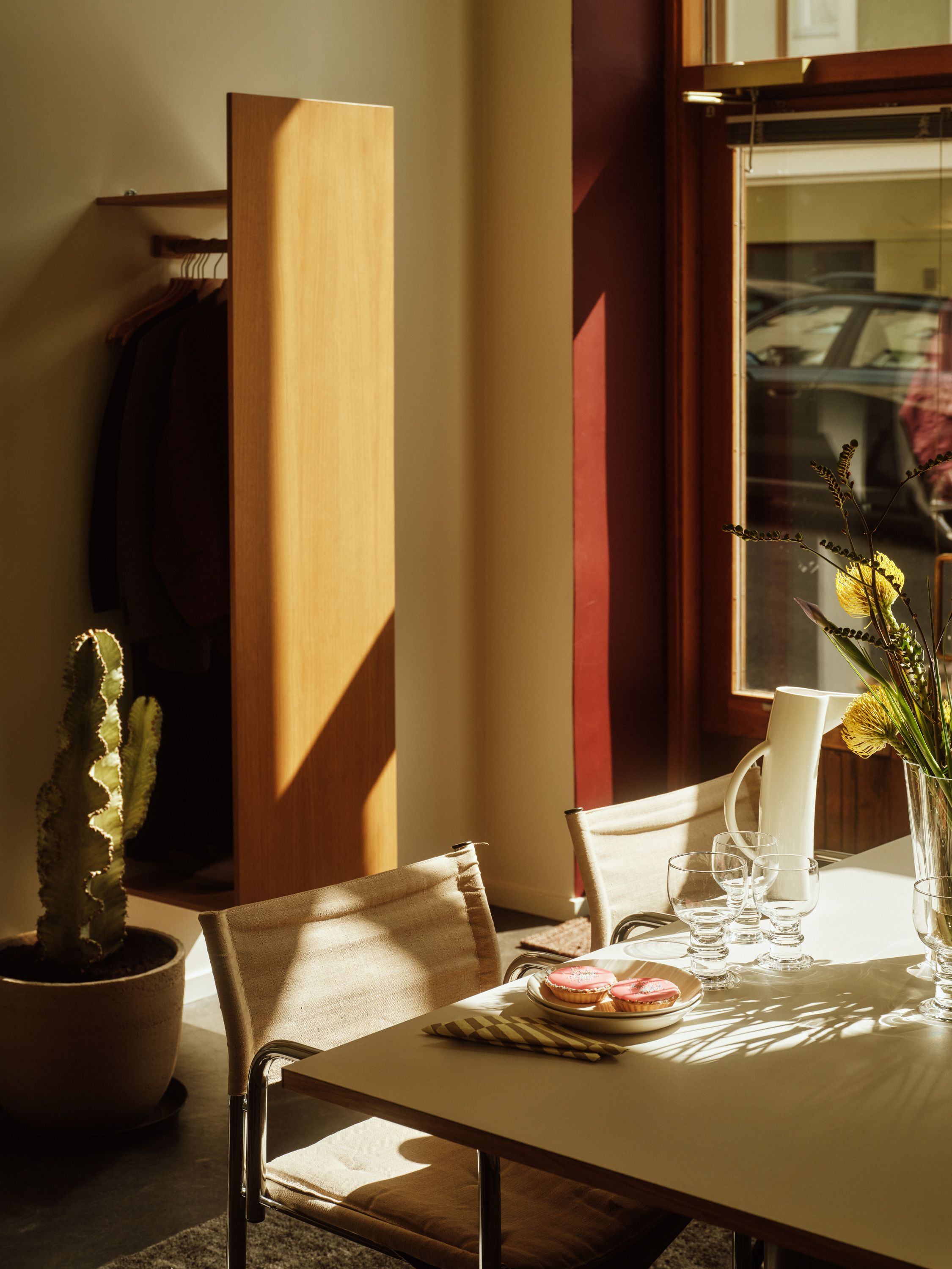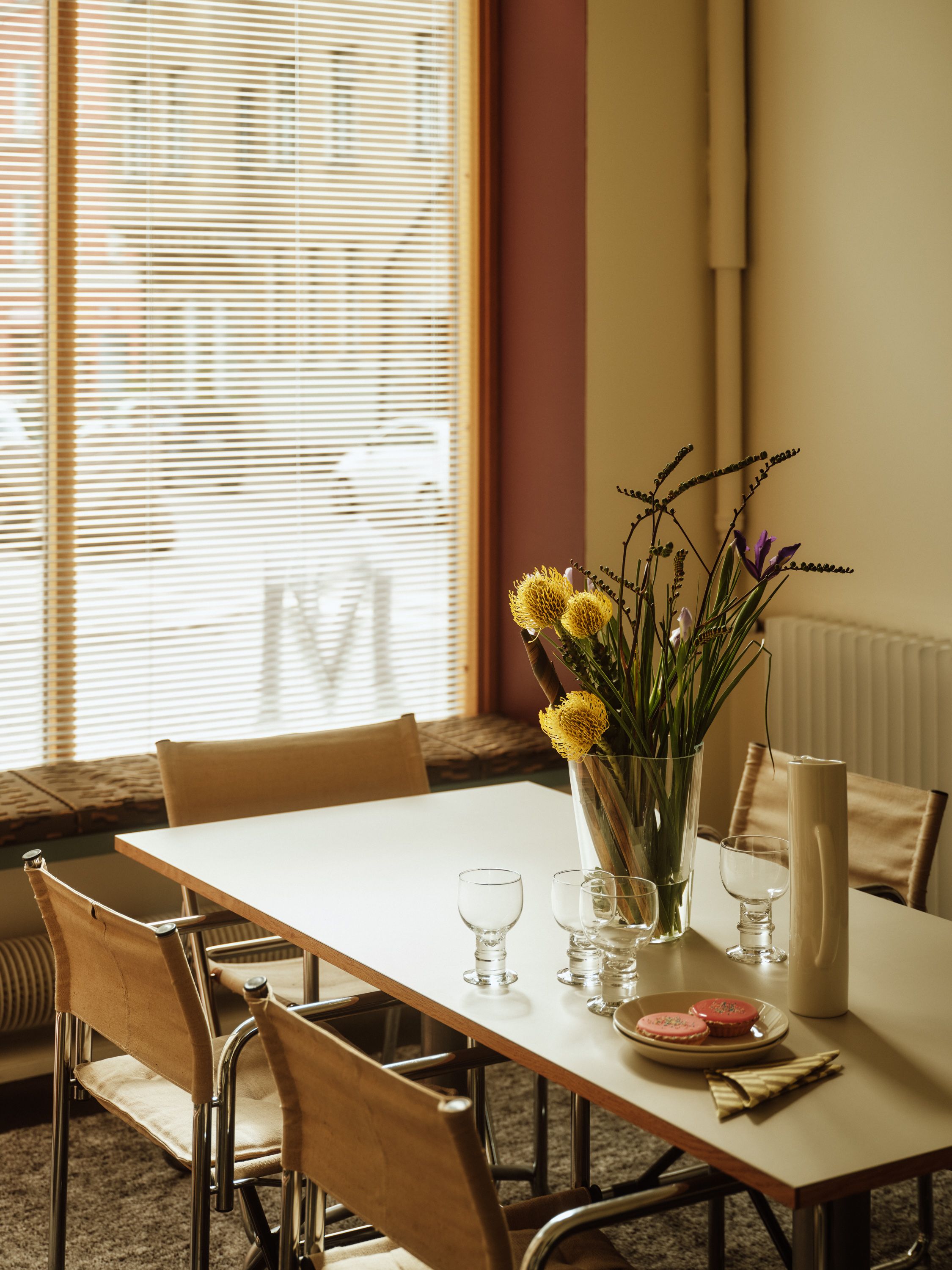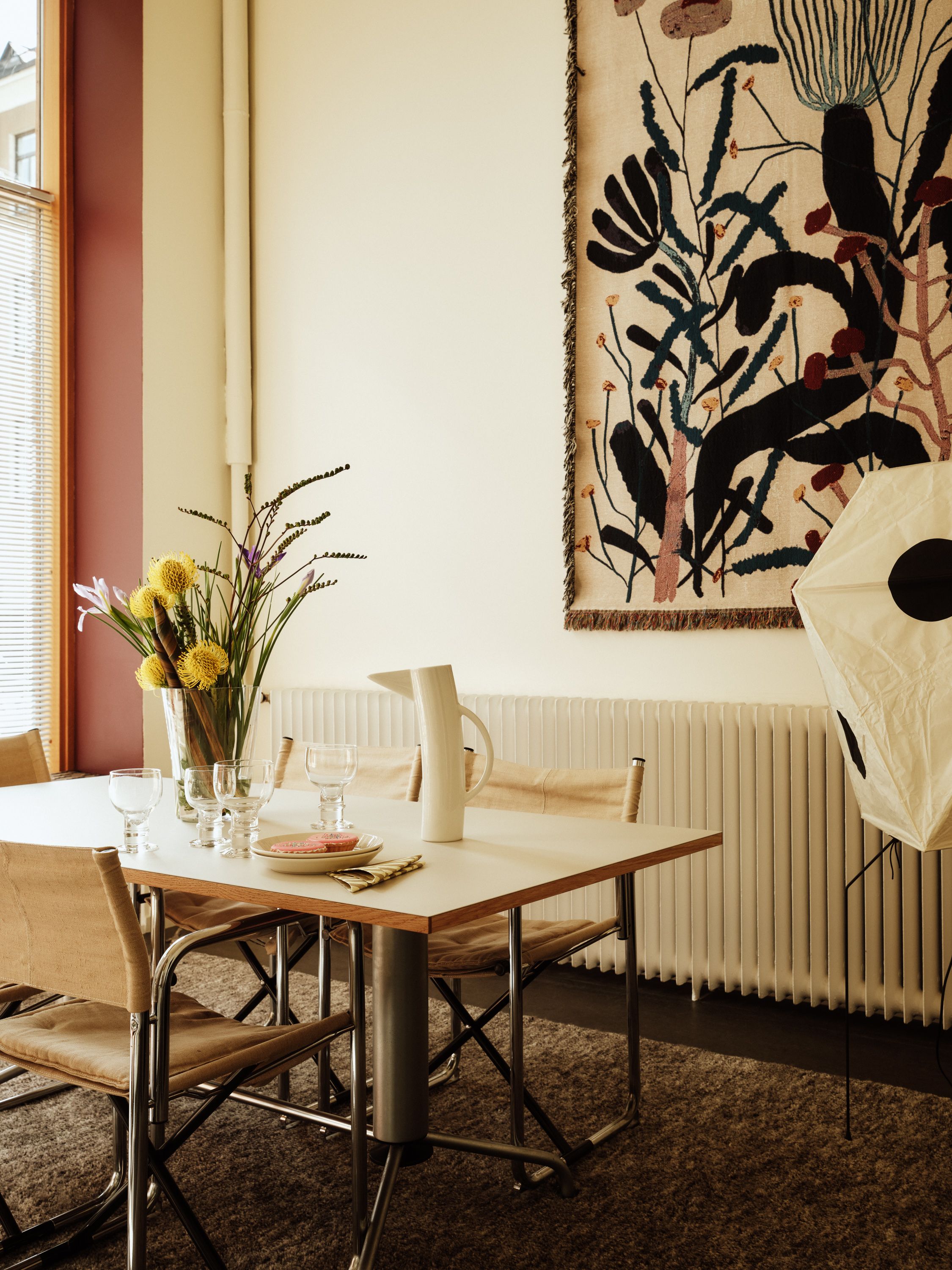 Soft tones of linen, burgundy and deep blue create a timeless atmosphere where ideas can unfold. “When I’m alone here, I sit on the windowsill, lean against the burgundy frame and write. From there, you can see all of Punavuori’s life,” she says. “We wanted a space that lasts — a bit classic,